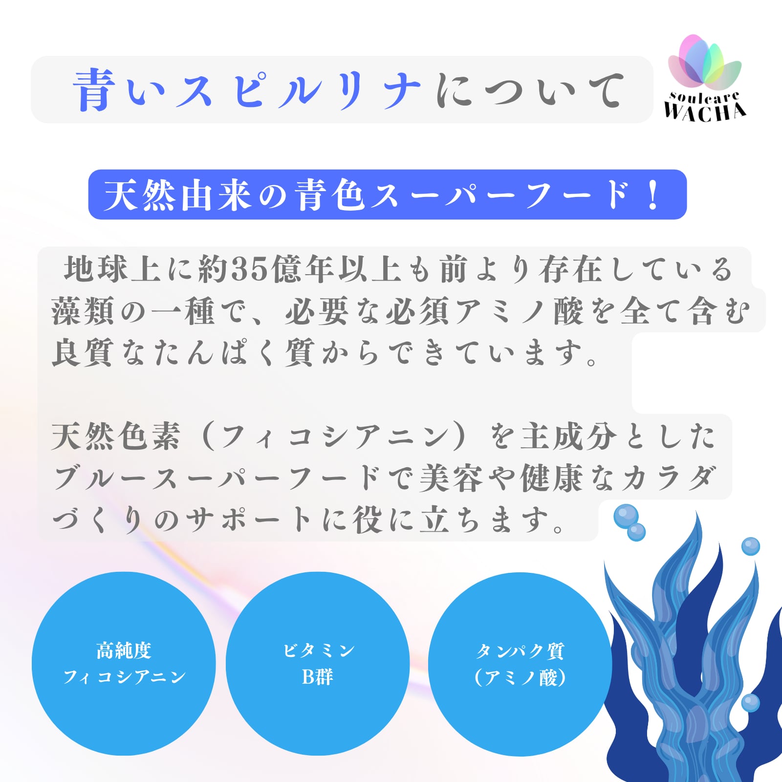 原材料:ブルースピルリナパウダー(メキシコ産)、フルーツパウダー(ブルーベリー、ココナッツ)(国産)、羅漢果、蔗糖