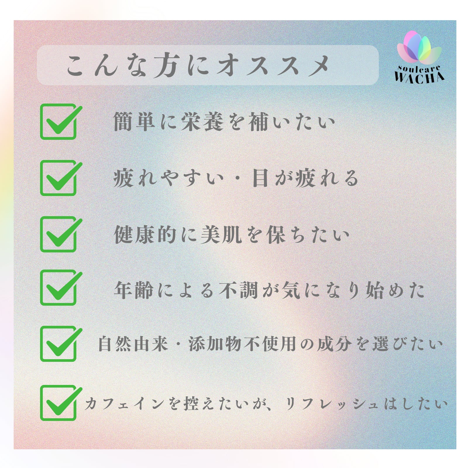 A. 2 g of matcha delivers about 60 mg of caffeine—less than the 80 mg in a cup of drip coffee. The caffeine is released more gently, easing strain on the body, and matcha's high theanine content helps keep jitters in check. Except the WACHA Green series, all WACHA blends are caffeine-free. 2 g の抹茶でカフェイン約 60 mg。ドリップコーヒー 1 杯( 80 mg)より少なく、カフェインの吸収がゆるやかで、身体への負担が少なく、興奮作用を抑制するテアニンも豊富。 WACHAは緑シリーズ以外はノンカフェインです。