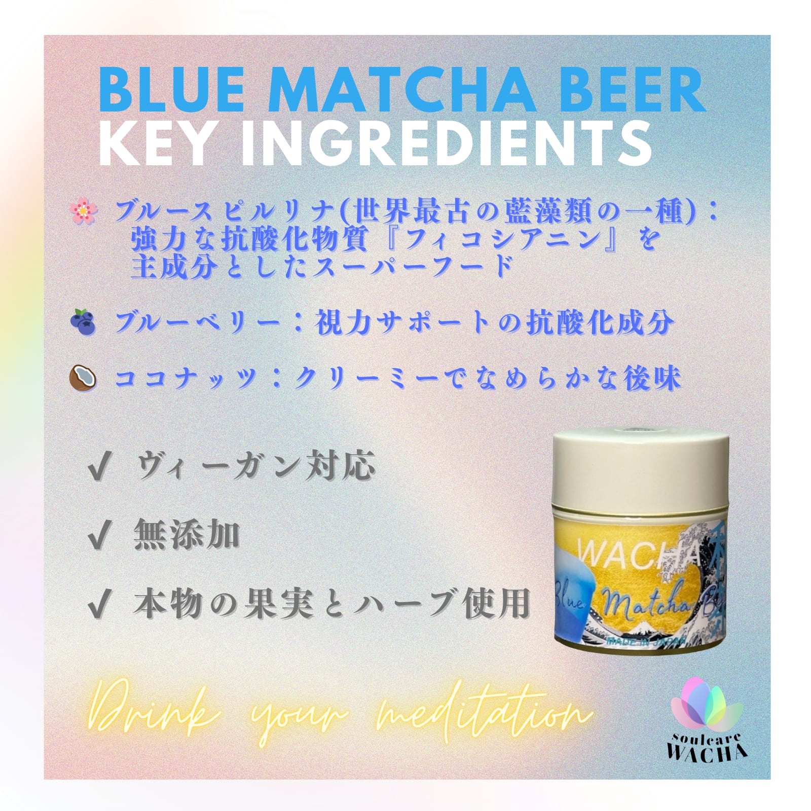WACHAのブルー抹茶は、目や脳の疲労ケアをサポートするウェルネスティー。本商品ではビールと組み合わせても鮮やかな青~緑になるように、ブルースピルナ由来の青で商品を開発。人工着色料は一切不使用。見た目にも美しく、心まで穏やかになるようなひとときをお届けします。