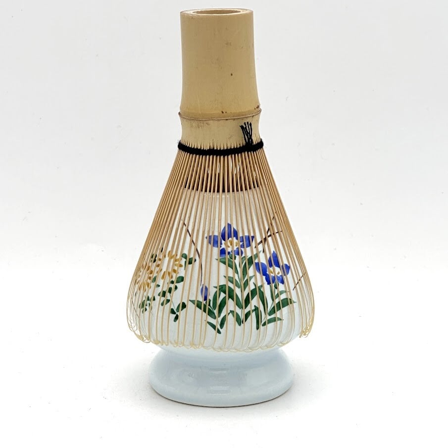 常滑焼の白磁に、清水焼の伝統工芸士が一つひとつ手描きでやわらかな白磁に咲く、秋の野の花々を描きました。りんどうと菊が寄り添うように描かれた、清水焼伝統工芸士による手描きの茶筅直しです。