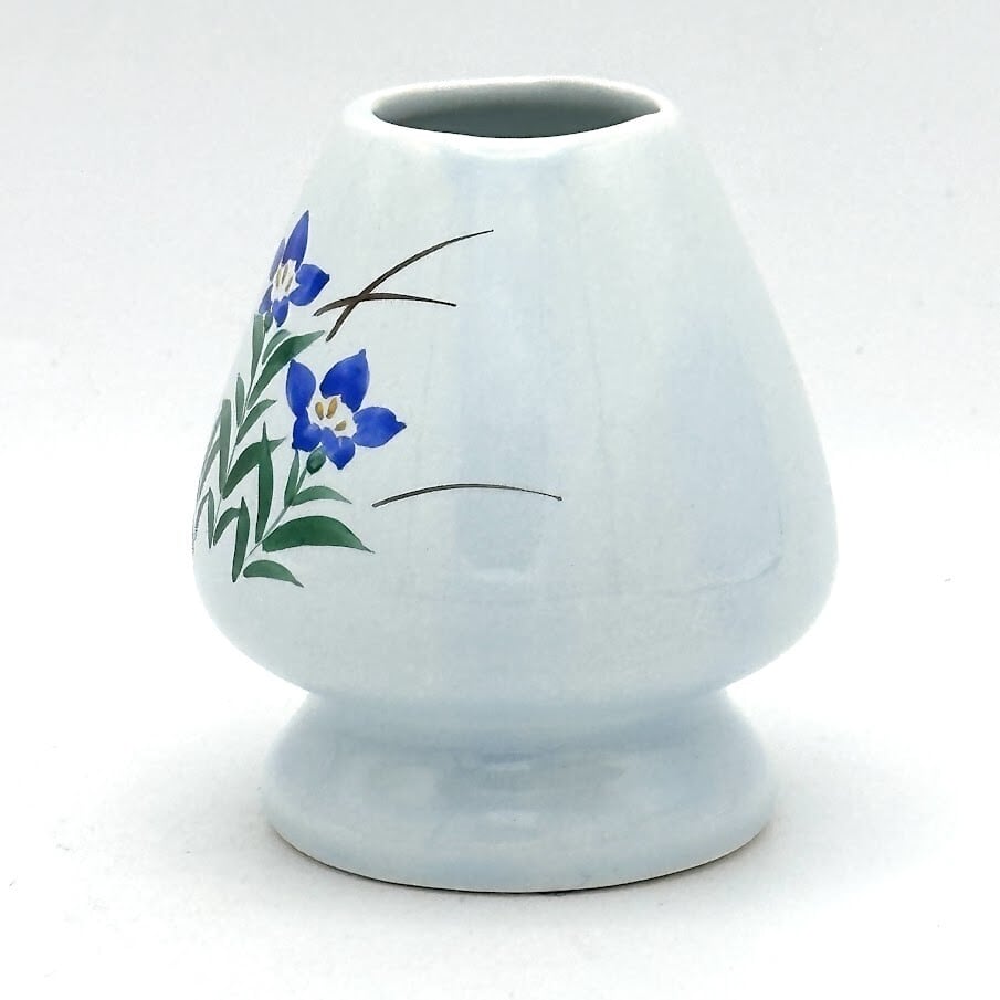 On fine white Tokoname porcelain, a certified Kiyomizu ware artisan has delicately hand-painted gentle autumn wildflowers — clusters of gentians and chrysanthemums blooming in harmony. This chasen rest is a hand-painted work by a traditional Kyoto craftsman, expressing the quiet grace of autumn through its elegant design.