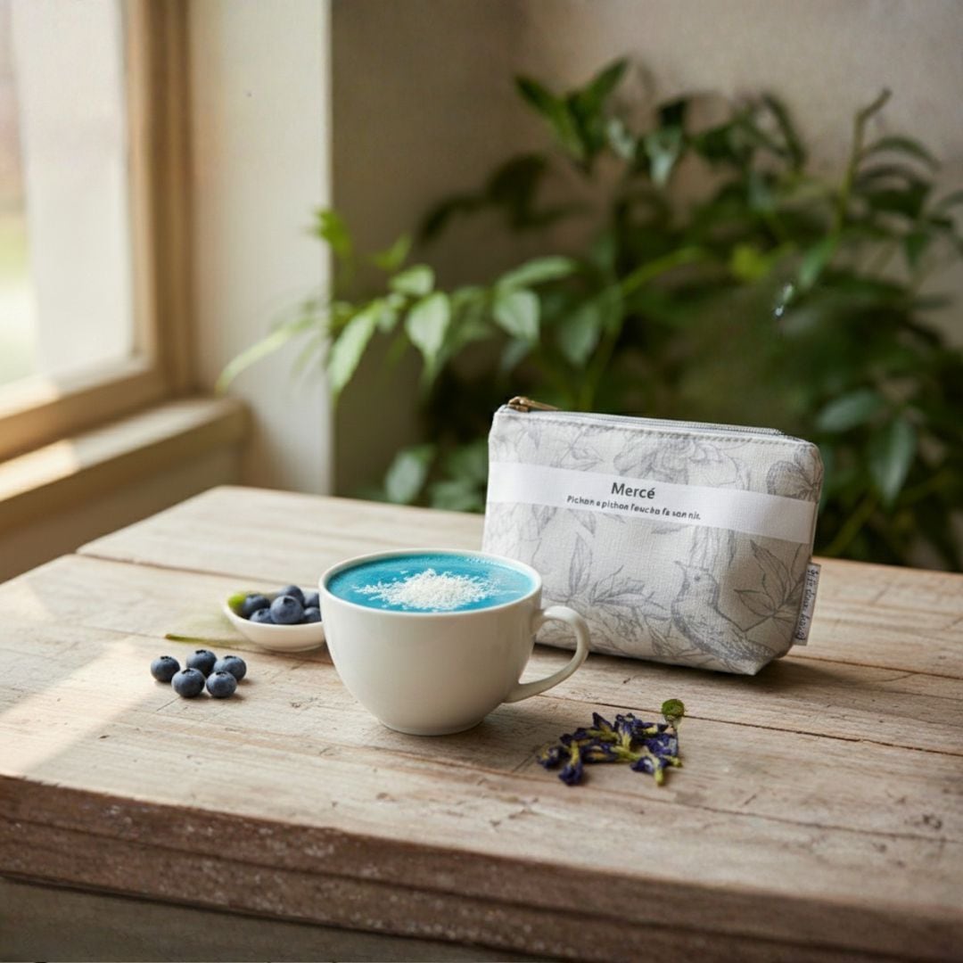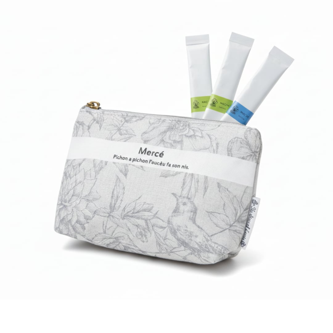 The Pouch is a charming item that combines the essence of WACHA’s botanical matcha with a natural organic texture and a delicate bird design.