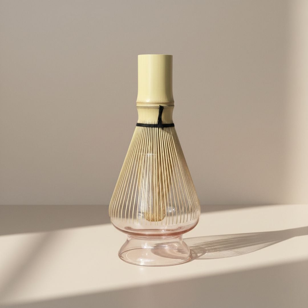 美濃焼の桜抹茶碗と80本立て茶筅、ピンクガラスのくせ直しを揃えた、初心者でもおうちで抹茶を楽しめる茶道具フルセットです。