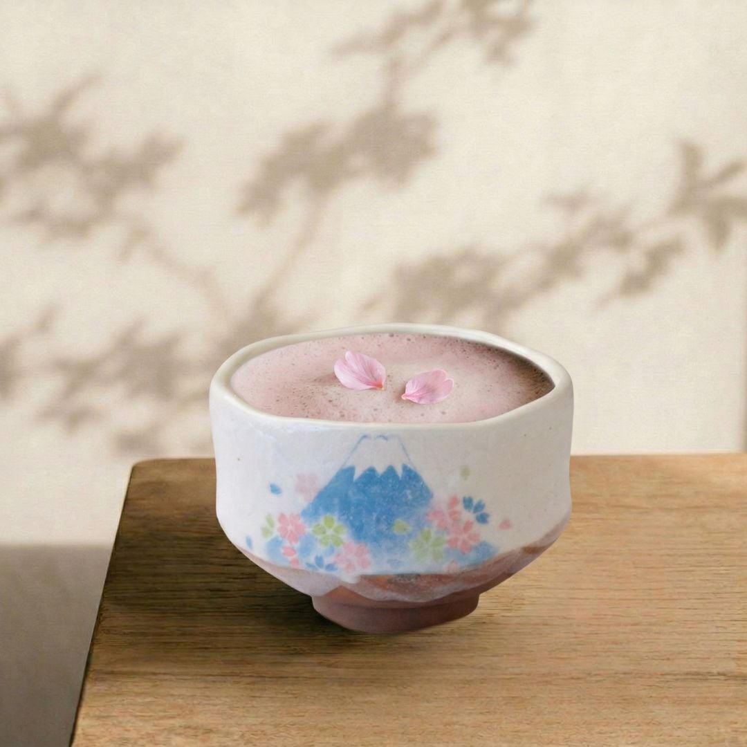抹茶スターターセット|富士山 桜 ミニ抹茶碗(美濃焼・日本製)+ミニ茶筅+桜抹茶20g|春限定 抹茶リチュアル 茶道 ギフトセット|WACHA