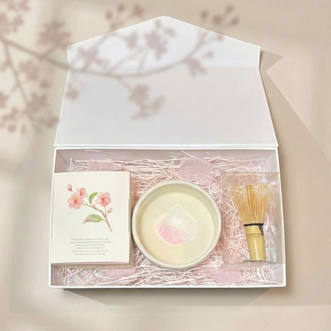 ミニ茶筅と桜抹茶缶を同梱し、はじめての抹茶時間をすぐに始められます。