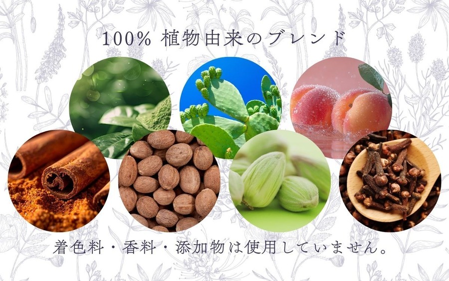 原材料:緑茶(国産抹茶)、桃、サボテンパウダー、羅漢果、蔗糖、シナモン、カルダモン、クローブ、ナツメグ